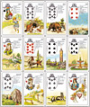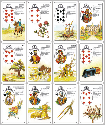 French cartomant and fortune teller famous as the Sybil of Paris, Marie Anne Adelaide Lenormand (or Le Normand) (1772-1843), used to work with the ordinary 36-playcards deck, but she invented her own system of interpretation featuring some aspects of Etteilla’s approach.