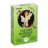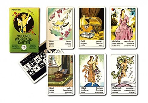An Edwardian era Cartomancy set from Vienna, with charming watercolored pen-and-ink art depicting circa 1900 era images of such evocative figures as the House, Judge, Sweetheart, Fox, Death, Merriment, Letter, and Desire. Each unnumbered card is identified at the bottom with its name in 6 languages: German, English, French, Italian, Hungarian, and Croatian. A 68-page book of cartomancy instructions in German, English, and French is included. This is a delightful self-interpreting cartomancy Oracle deck for beginning card readers (36 cards).
