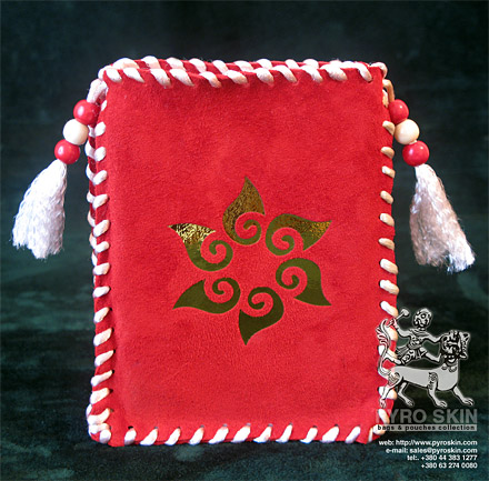 Red suede bag for Tarot cards or any magical accessories with a gold stamping of an ancient Slavic symbol of Kolovrat (Solntzevrat).