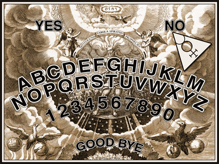 Spirit board on which are marked the letters of the alphabet. Answers to questions are spelt out by a pointer held by the fingertips of the participants, and are supposedly formed by spiritual forces.