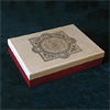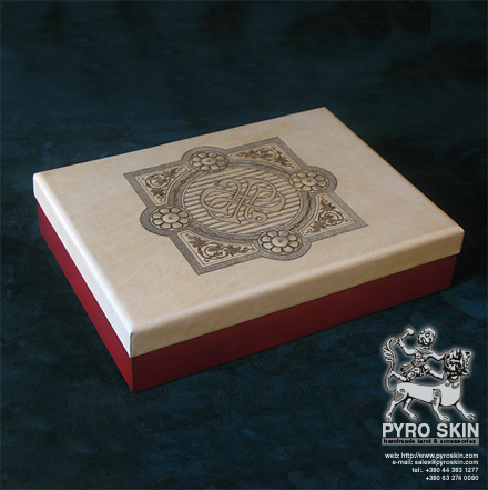 Wooden tarot box with engraved leather cover for storage of tarot decks or any other necessary accessories. Its height - 50 mm, width - 240 mm, length - 285 mm.