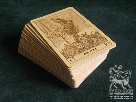 You can buy with this handmade Tarot deck special wooden box with engraved leather cover (you can customize engraved ornament, or just buy wooden box without any engravings, with the varnished and polished cover). In this section Boxes, tubes, vessels you can see an examples of wooden boxes with engraved leather covers.