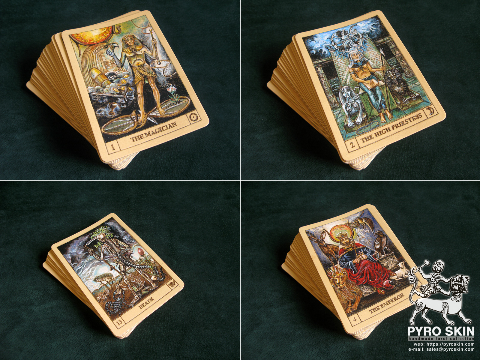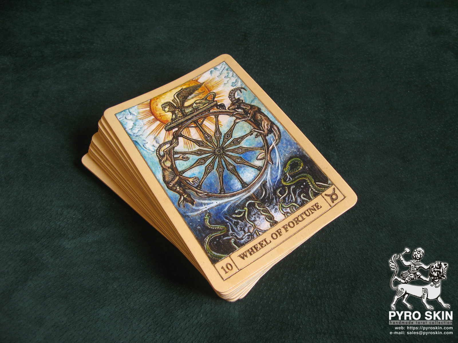 You can buy with this handmade Tarot deck special wooden box with engraved leather cover (you can customize engraved ornament, or just buy wooden box without any engravings, with the varnished and polished cover). In this section Boxes, tubes, vessels you can see an examples of wooden boxes with engraved leather covers.