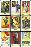 An art-deco era cartomancy set from Vienna, with charming art depicting 1920-1930 era images. Each unnumbered card is identified at the bottom with its name in 6 languages: German, English, French, Italian, Hungarian, and Croatian. This is a delightful self-interpreting cartomancy Oracle deck for beginning card readers (52 cards).