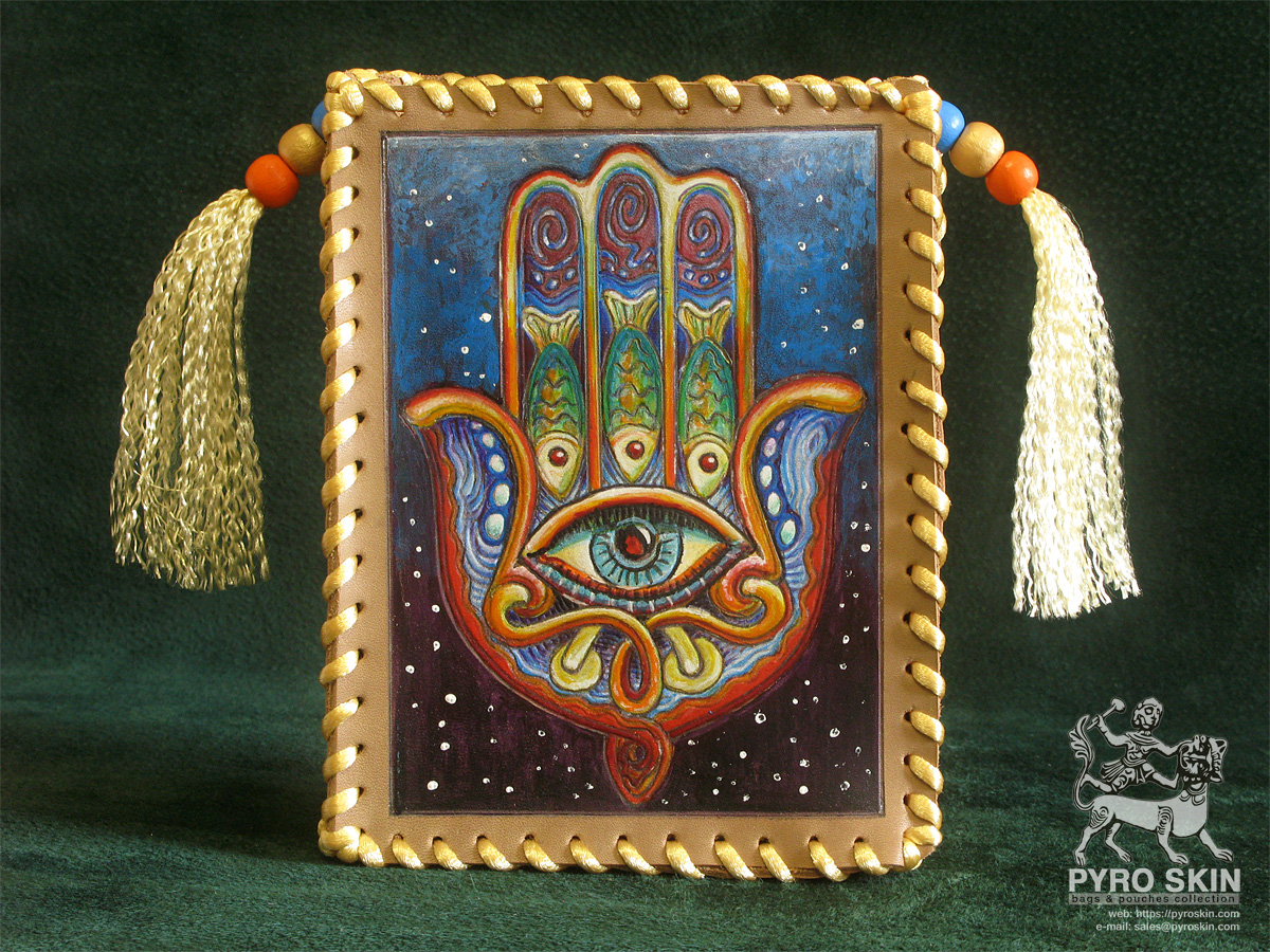 Leather bag for Tarot cards or any magical accessories with handmade colored engraving of Hamsah(or in another sources named as Fatima's or Miriam's hand) - talisman against evil eye.