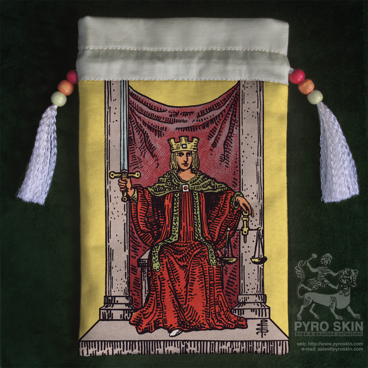 Silk bag for Tarot cards or any magical accessories with wide image of Justice card from original Rider-Waite-Smith Tarot deck issued in 1910.