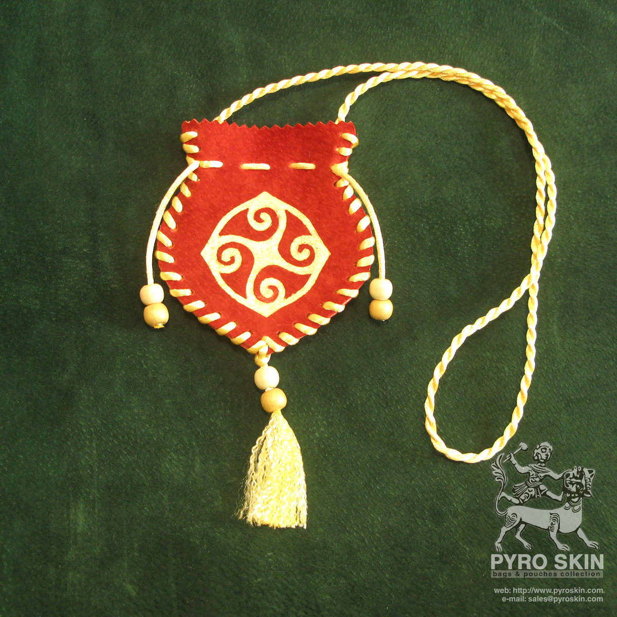 Red leather talisman for spices or any magical accessories with embossed engraving of magical Odin's wheel.