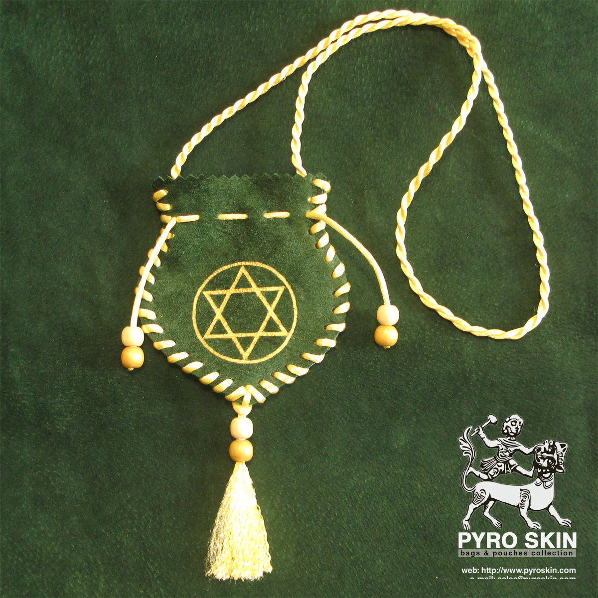 Green leather talisman for spices or any magical accessories with embossed engraving of Shield of David.
