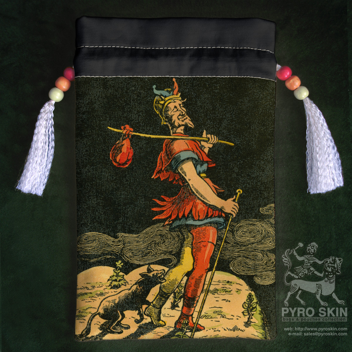 Silk bag for Tarot cards or any magical accessories with wide with the image of Jester card from the original Laseniс Tarot deck of 1940.