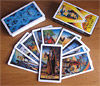 A male-oriented deck has brightly coloured book type artwork and uses the typical suits of cups, wands, swords and disks.