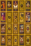 The Major Arcana are presentations of the archetypes created in rich, but muted colors, their images are placed against brown background, so all elements of the color scheme make the old-fashioned, yet luxurious, feeling of the deck.