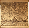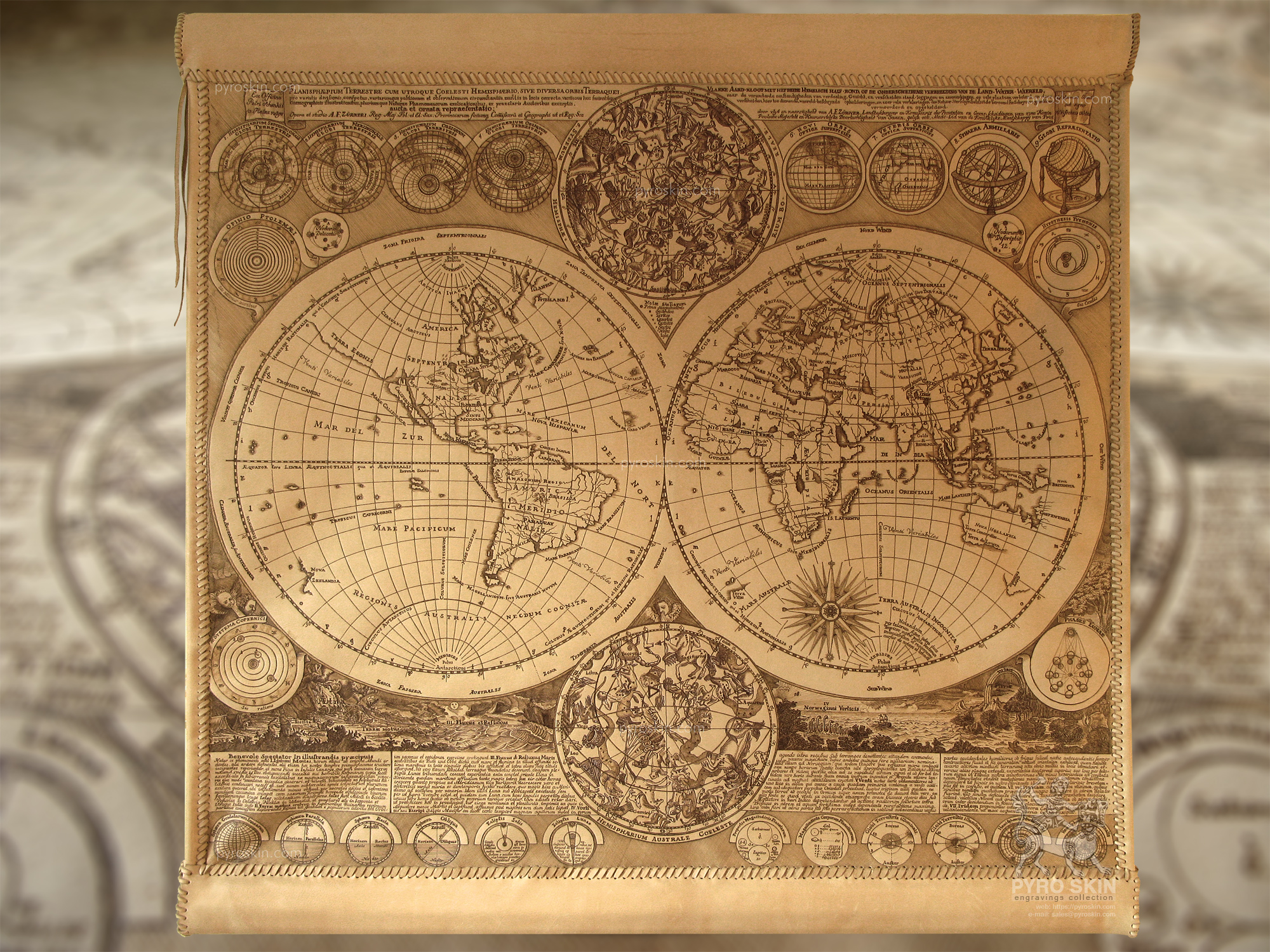 : "Planisphaerium terrestre cum utroque coelesti hemisphaerio, sive diversa orbis terraquei: vlakke aard-kloot met het beide hemelsch half-rond, of de onder scheidene verbeelding van de land-water-waereld" - This double hemispherical world map by Adam Friedrich Zürner depicts the routes of explorers including Magellan, Dampier, Tasman and Chaumont. Relief is shown pictorially. The map is from "Atlas contractus sive mapparum geographicarum", published by Peter Schenck at the beginning of the 18th century. Artwork created as handmade pyro engraving on leather with soft braided frame.
