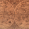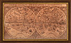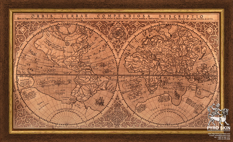 : Gerard Mercator's great world map of 1569 was condensed into double hemispherical form by his son Rumold Mercator. It first appeared in 1587 and was incorporated into his long-lived and influential Atlas from 1595 to 1602. Mercator was the first to make a distinction between North America and South America. The engraving is a model of clarity and neatness, with typical cursive flourishes to the lettering of the sea names. Surrounding the hemispheres is a strapwork border; between them at the top is an armillary sphere and at the bottom an elaborate compass rose. Artwork recreated as framed handmade leather pyro engraving.