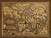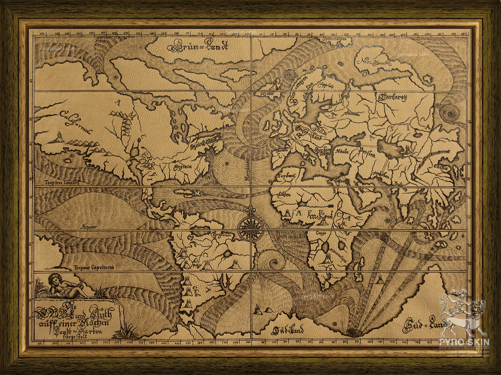 : “Die Ebbe und Fluth auff einer Flachen Landt-Karten furgestelt”. Very interesting collector's map published in Ulm, Germany (1687-1708). This unusual decorative map describes the ocean currents and the location of active volcanoes. Two curious tracks perhaps marking some kind of subterranean tunnel, link the Caspian Sea with the Black Sea and the Persian Gulf. Although suppositional in some parts, the map is a serious attempt to describe scientific phenomena based on reported findings of seamen and travellers of the XVII century. Map recreated as handmade framed pyro engraving.