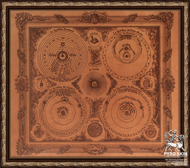: The decorative engraving representing evolution of understanding in creation of model of the Universe from geocentric to the heliocentric.