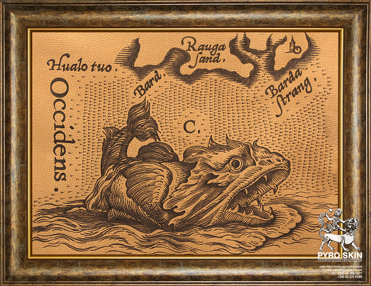 : Abraham Ortelius Iceland bestiary. Six ocean monsters series. Third monster marked (С). Leather pyro engraving. Handmade artwork.