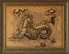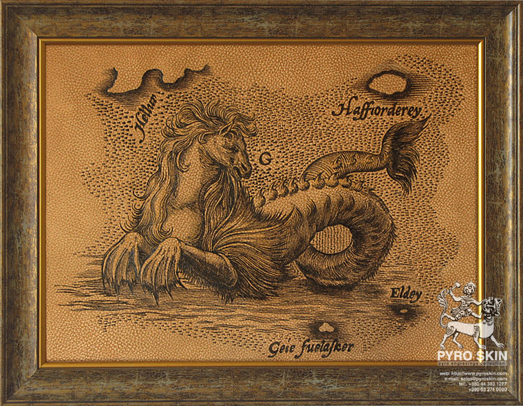 : Abraham Ortelius Iceland bestiary. Six ocean monsters series. Second monster marked (G). Vellum pyro engraving. Handmade artwork.