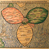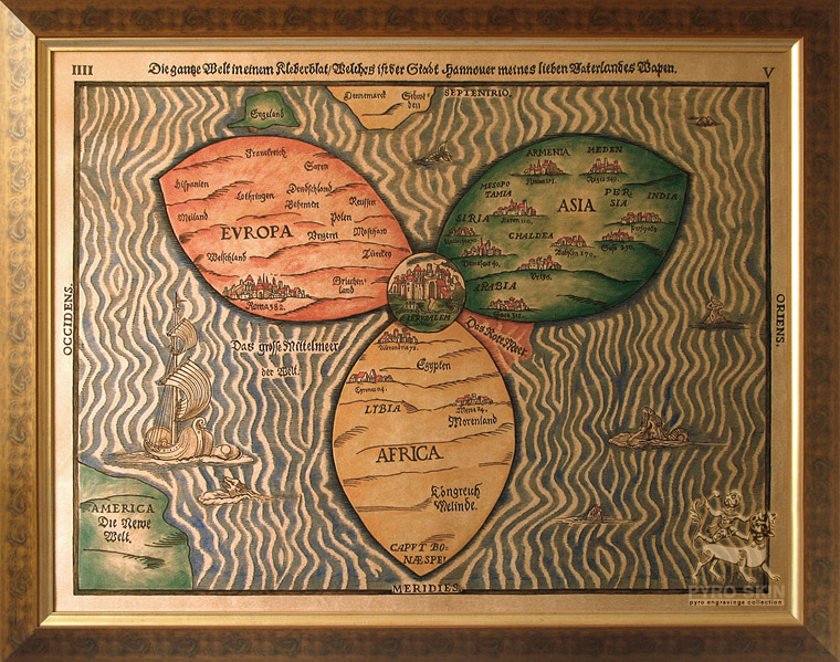 Yet he delighted in drawing other symbolic maps, examples of which can be anthropomorphic (Europe as a virgin) or hippomorphic (Asia as a winged horse). This particular map is a tribute to Buntings hometown Hanover, as the text above the map indicates: Die ganze Welt in einem Kleberblatt welches ist der Stadt Hannover meines lieben Vaterlandes Wapen (‘The Whole World in a Cloverleaf, Which Is The Coat of Arms of Hannover, My Dear Fatherland’).