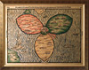 : The map shows a world divided into three parts (Europe, Asia and Africa), connected at a single central point: Jerusalem. This is essentially still the same symbolic map of the world as the one first devised by Saint Isidore in the seventh century. Isidore’s ’T and O’-shaped map, itself inspired by Scripture, influenced Christian European mapmaking up until the age of discovery. Artwork recreated as framed colored vellum pyro engraving.