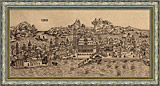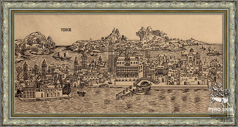 : View of Venice, from Hartmann Schedel, Nuremburg Chronicle. Created by Michael Wolgemut, German, 1434-1519, and Wilhelm Pleydenwurff, German, ca. 1458-1494. Artwork recreated as framed handmade vellum pyro engraving.