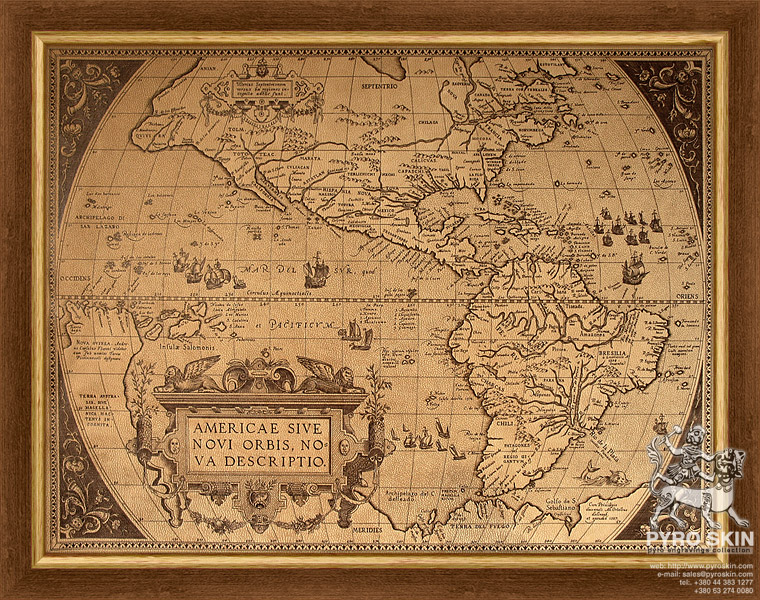 : One of the best-known and influential maps from the Theatrum Orbis Terrarum. The Archives of Ontario's version of this map originally came from the 1579 Latin edition of the atlas. Artwork recreated as framed handmade vellum pyro engraving.