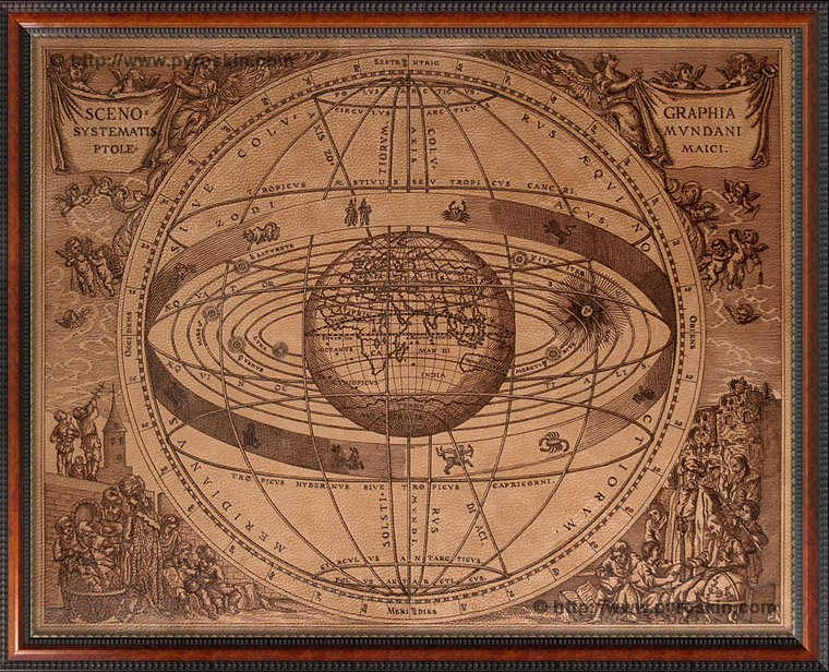 : Cellarius' Scenographia Systematis Mundani Ptolemaici is a perspective rendering of the earth-centric solar system described by Ptolemy and accepted by the civilized world before Copernicus. Earth is rotated to show the entirety of the Old World of Europe, Asia and Africa. The sun and planets are on their earth-centered orbits. The celestial star sphere is a band of constellations surrounding the solar system. Artwork recreated as framed handmade vellum pyro engraving.
