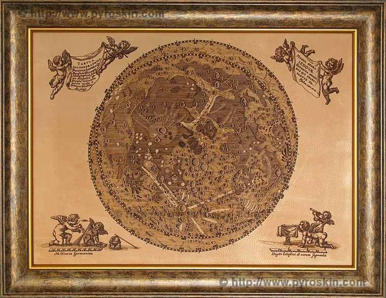 : A fascinating and decorative map of the visible side of the Moon dated 1647 (Plate #1). Author - Johannes Hevelius (1611-1687). Artwork recreated as framed handmade vellum pyro engraving.