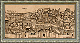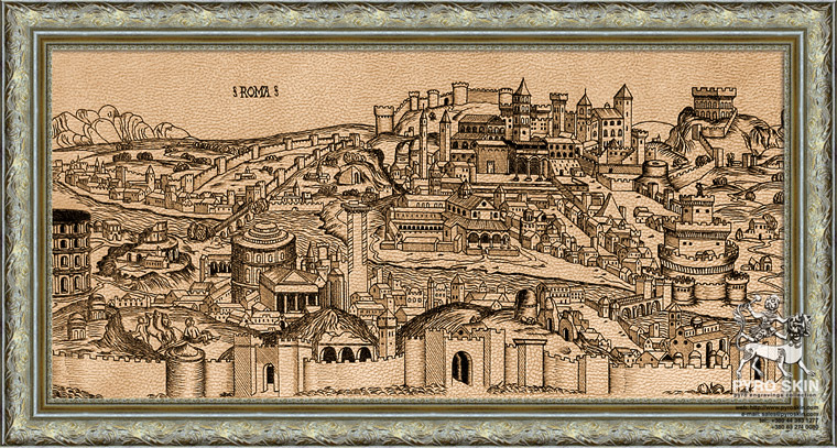: View of Rome, from Hartmann Schedel, Nuremburg Chronicle. Created by Michael Wolgemut, German, 1434-1519, and Wilhelm Pleydenwurff, German, ca. 1458-1494. Artwork recreated as framed handmade vellum pyro engraving.