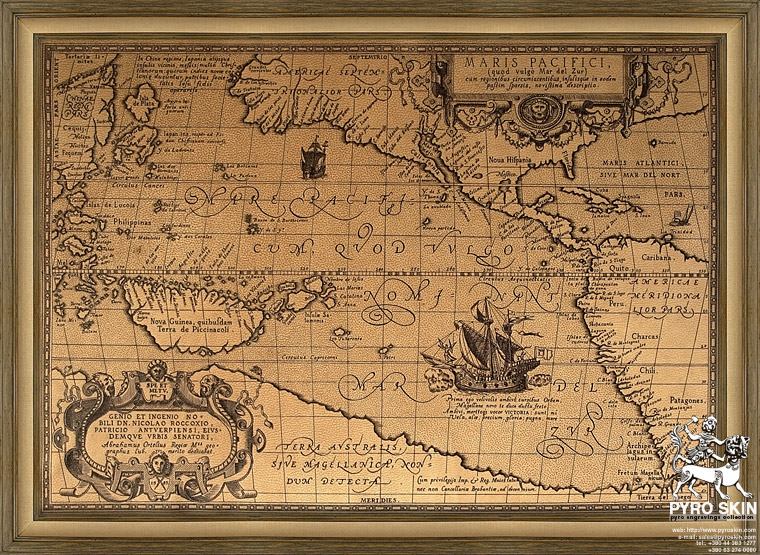 : Maris Pacifici is the first dedicated map of the Pacific to be printed. It was drawn by Abraham Ortelius in 1589, and is based on Frans Hogenberg's map of America from the same year, and Vaz Dourado's 1568 description of Japan. Artwork recreated as framed handmade vellum pyro engraving.
